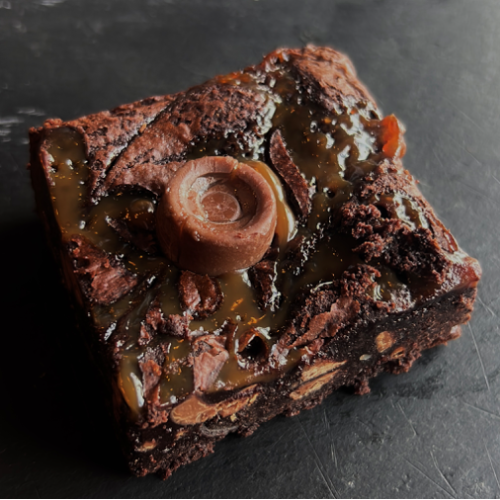 Fuel your sweet tooth with our oversized Millionaires Brownie Slab! This spectacular creation boasts a generous layer of caramel, crowned with a magnificent blend of milk and white chocolate. It's a dessert fit for the champions of indulgence!