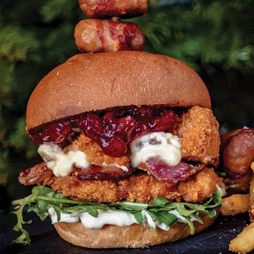 £15.00Choice of Chicken fillet or Beef Patty, Streaky Bacon, Cranberry sauce, Mayo, Melted Breaded Brie, Rocket & topped with 2 Pigs in Blankets