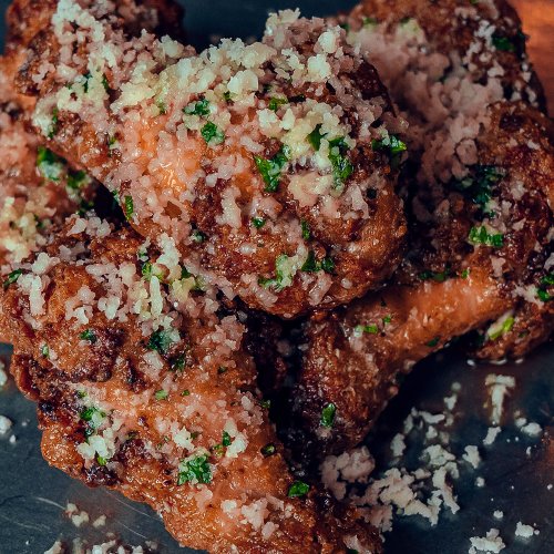 Crispy coated chicken wings covered with a garlic butter topped with Parmesan.